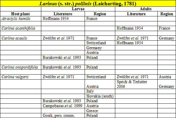 Larinus (s. str.) pollinis (Laicharting, 1781) (= syn. L. brevis (Herbst, 1795)) is widely distributed from France across the southern and eastern regions of Europe, the Near East, Kazakhstan, and West Siberia to Korea [Mazur 2001]. L. pollinis is a stenotopic, xerothermic and oligophagous species that is associated with plants from the genus Carlina [Koch 1992][Mazur 2001].
