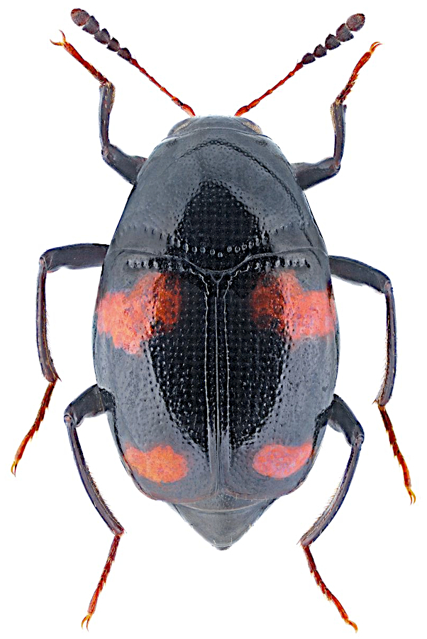 Adults are small, approximately 4.5 - 6 mm in size. Their body is shortly oval and strongly shiny. The colouration is black with the typical four irregular red spots - two on each elytra (hence the species name quadrimaculatum). The elytra are usually strongly punctate, the tibiae with striations.