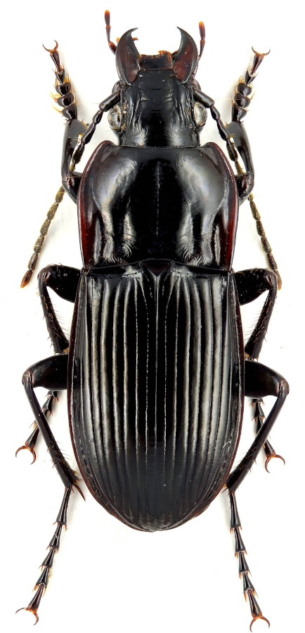 Size 15.8 - 20.8 mm. It is all black. The protonum has two longitudinal depressions on each half and one narrow groove runs through the middle of the shield. Males are shiny, females are dull.