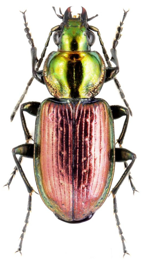 Size 7.5 - 9.9 mm. The body is black, the head and protonum are most often blue-green and the elytra are bright red-copper with a green border. It can also be bronze-green, blue, purple or brass-black with frequent transitions when the protonum and elytra are different in color. There are typically 6 holes on the elytra, but the total number can be 1 to 10.