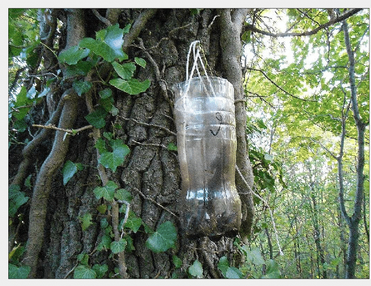 As the name suggests, tree traps are used mainly for beetles that crawl on tree trunks and branches. They are attached to the trunks and branches of trees so that they can be easily reached by crawling beetles. They usually consist of a plastic bottle that has a cut-off top with a neck. This top part is turned and inserted into the bottom part so that the neck faces the bottom of the bottle. It actually forms a funnel that allows the beetles to enter the bottle. They will find it very difficult to find their way out. In order to allow the beetles to climb even on the smooth walls of the bottle, a thin fabric (e.g. from old women's tights) is placed on the bottle. Traps are usually attached by tying them around a log or branch. Preferably, these traps can also be used on metres of wood.