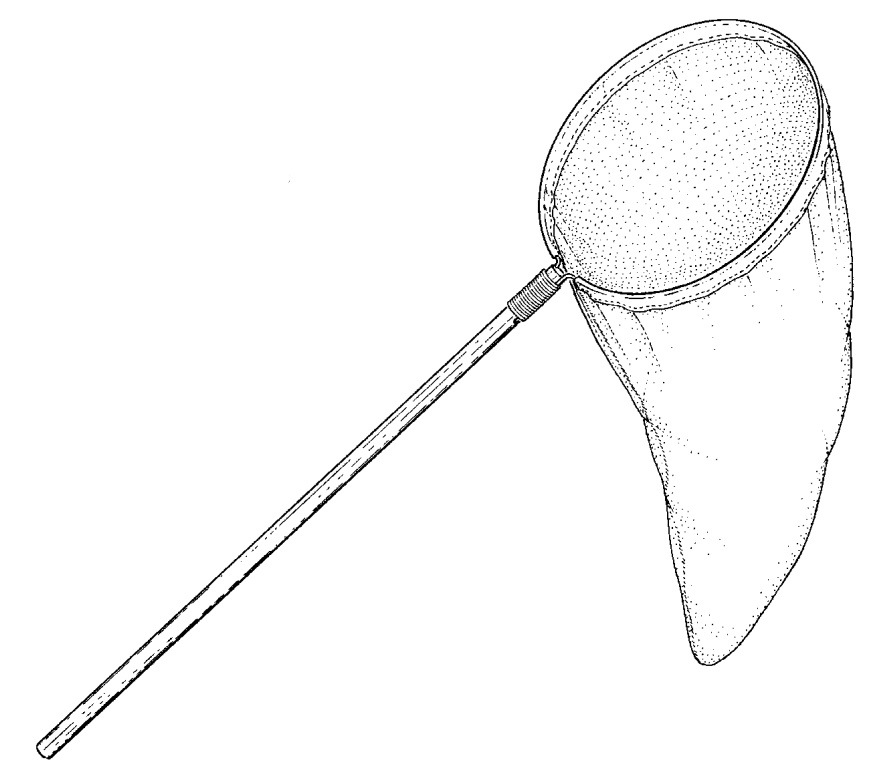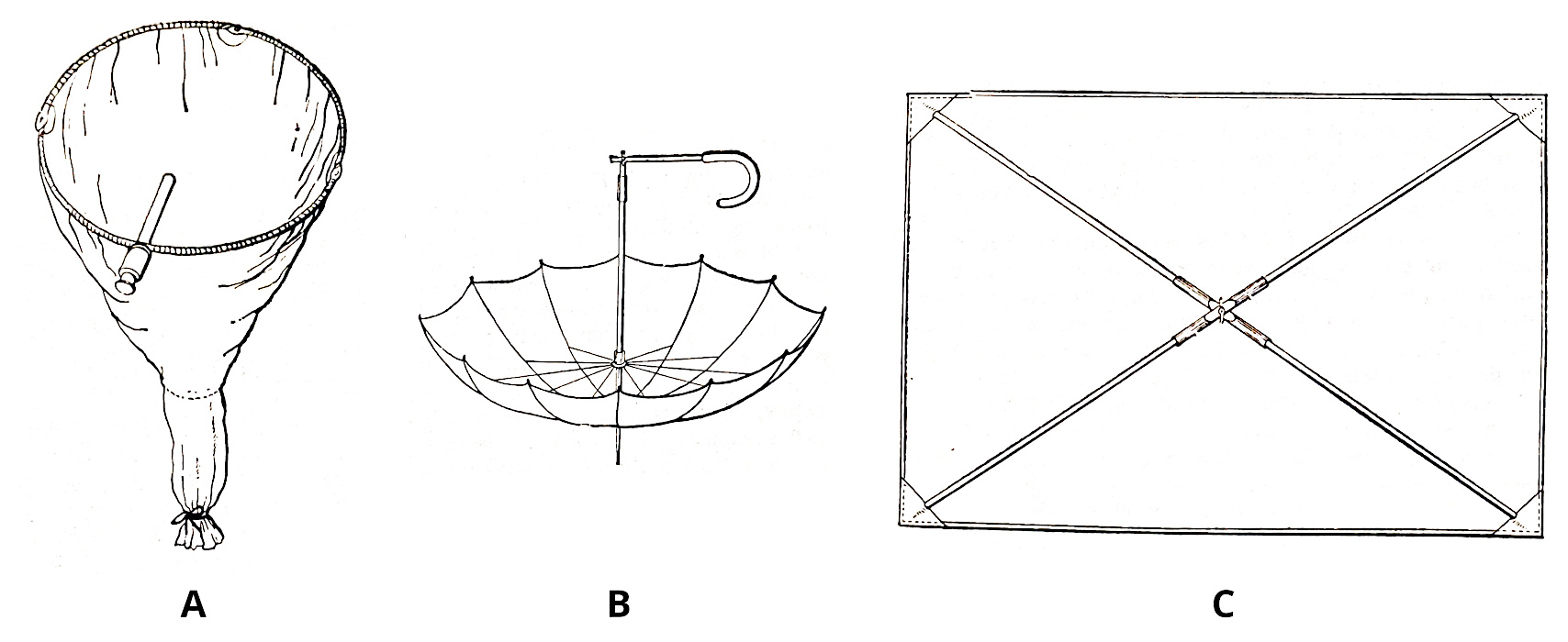 Beetles whose life is linked to the bark of trees are caught using a tool called the Tree bark net or U-Type Insect Net. This net consists of a rigid hemispherical frame about 35 cm in diameter, the ends of which are connected by a flexible material such as rubber cord. On this frame is attached a net made of strong canvas about 40 cm long. The frame is fitted with a sturdy handle. The appearance of the net is shown in the picture.