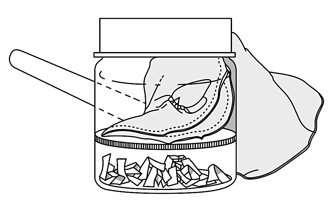 The softening net is most often used to soften lower plants, shrubs or weaker branches of young trees. A fly net usually catches species living on the stems, leaves and flowers of plants. It is necessary to move the sweep net constantly, preferably by tracing the shape of a lying figure eight. This is the only way to ensure that the insects caught in the net do not fly away again. It can also be used to immediately and quickly trap larger branches. When we are netting, we slide the net under the branch, shake the branch quickly and immediately start to use the net to make a figure of eight. When shearing, be careful not to unnecessarily damage the flowers of the plants and avoid contact with the spines that some plants are equipped with. After shearing, fold the net over the edge of the frame to prevent insects from escaping from the net before preparing to process its contents. Either carefully transfer the contents of the net into a prepared larger polythene bag, or use an exhaustor to catch them, or place part of the net with the captured specimen directly into a prepared death net (see picture).