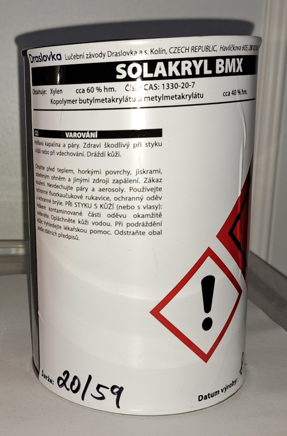 Solacryl BMX is a solution acrylic resin based on a copolymer of butyl methacrylate and methyl methacrylate dissolved in xylene.