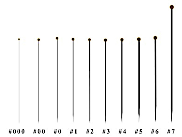 These are special pins made of steel wire with a basic length of 38-39 mm, which are varnished to prevent rusting from the body fluids of the prepped specimens. They are manufactured in thicknesses of 000 to 7 (see table).