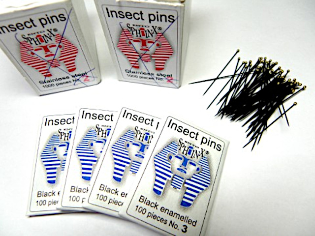 I use tailor's pins for larger specimens (approx. > 20 mm), for smaller specimens (15 - 20 mm) I have reserved stainless steel pins number 000.