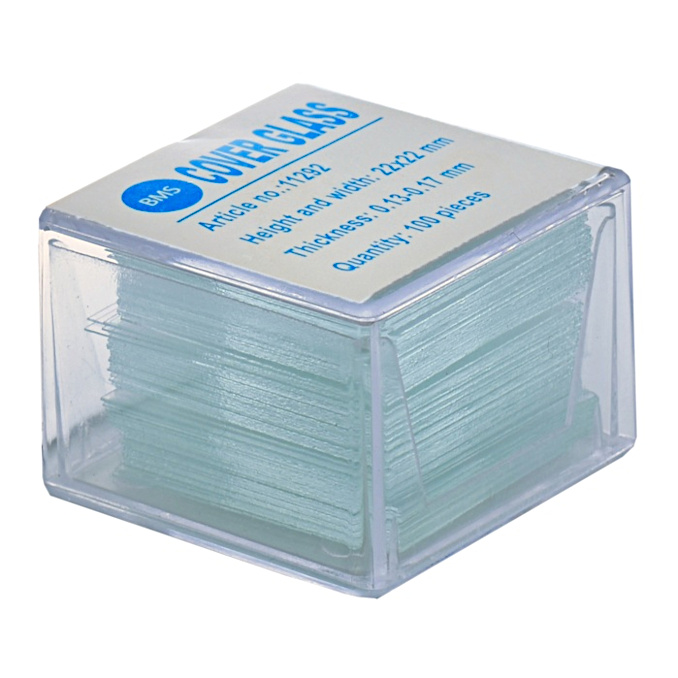 The slide is then covered with a cover glass, which can also be of different size and shape (square, rectangle, circle).