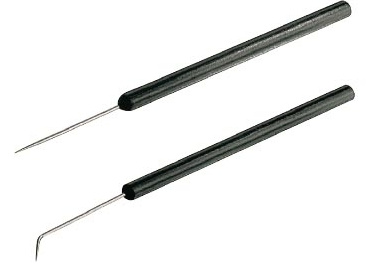 Preparation needles are used to flatten limbs and antennae during preparation. We use needles that are straight or slightly curved. Depending on the size of the material to be prepared, the needles may also have different diameters. In the beginning we make do with an entomological pin, but with increasing practice everyone will find the needle (shape and thickness) that suits them best during preparation. Then we buy professional needles or we can make such needles from entomological pins of suitable thickness, which we glue into a suitable handle. The handle is made from a wooden log or an ordinary pencil, into which a hole is drilled, and a suitable entomological pin is fixed into the hole using instant glue.