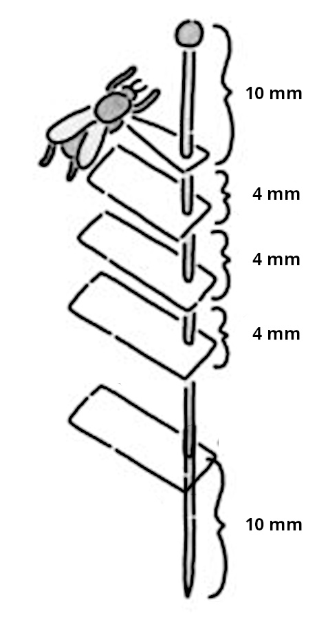 The standard length of an entomological pin is 38 mm. In order to avoid damage to the specimen when handling the pin, it is necessary to keep a distance of about 10 mm between the head of the pin and the specimen itself. For this reason, large specimens are impaled at a height of 10 mm from the top edge and small specimens are impaled at a height of 25 mm from the bottom edge of the pin.